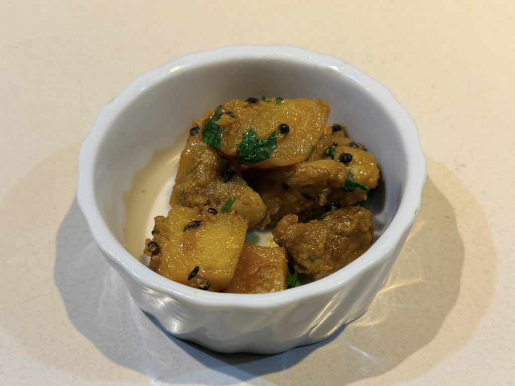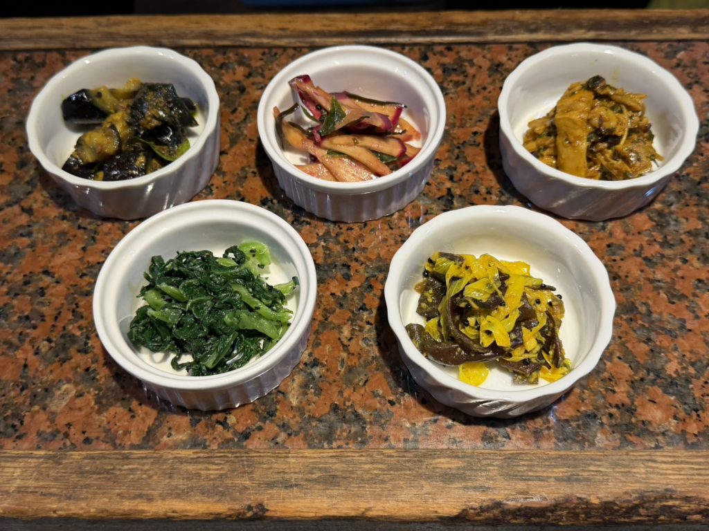 この日の副菜はそれぞれアチャールで、茄子、かつお菜、赤かぶ、きくらげと長ネギ、色々きのこの5種。どれも美味しいのですが特にきのこはこれだけで冷製ドライカレーと言える仕上がりで好みでした。