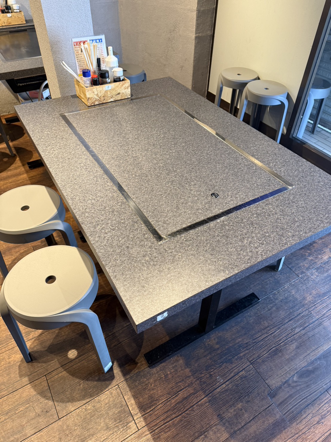 店内各テーブルに鉄板設備を完備しておりますが、フタをしてテーブルとしてご利用お願いします。※鉄板を使用した営業をご希望の場合はご相談ください。