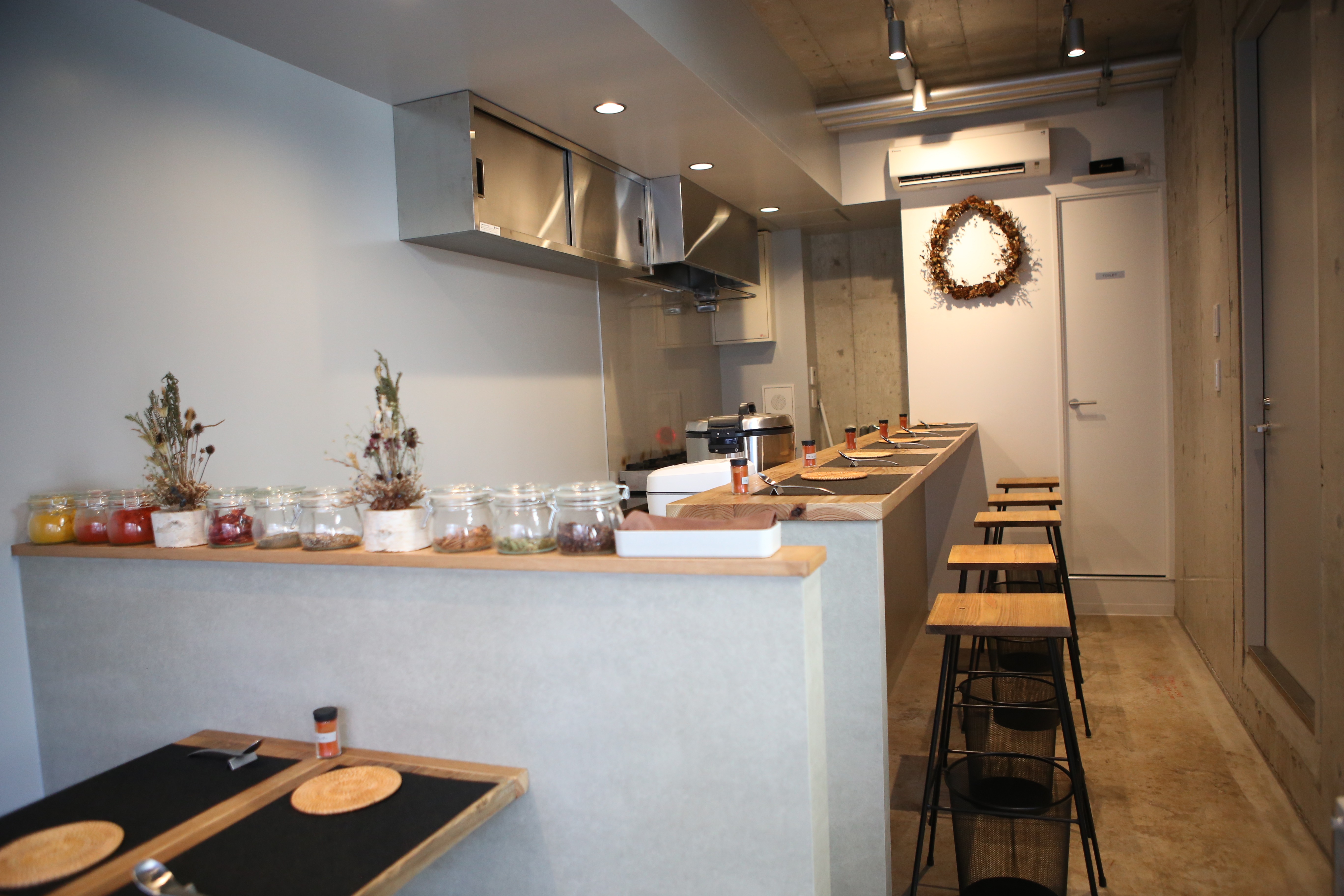 カウンター5席、テーブル2席の計9席でお一人でもオペレーション可能な丁度良いサイズ感の店舗になります。