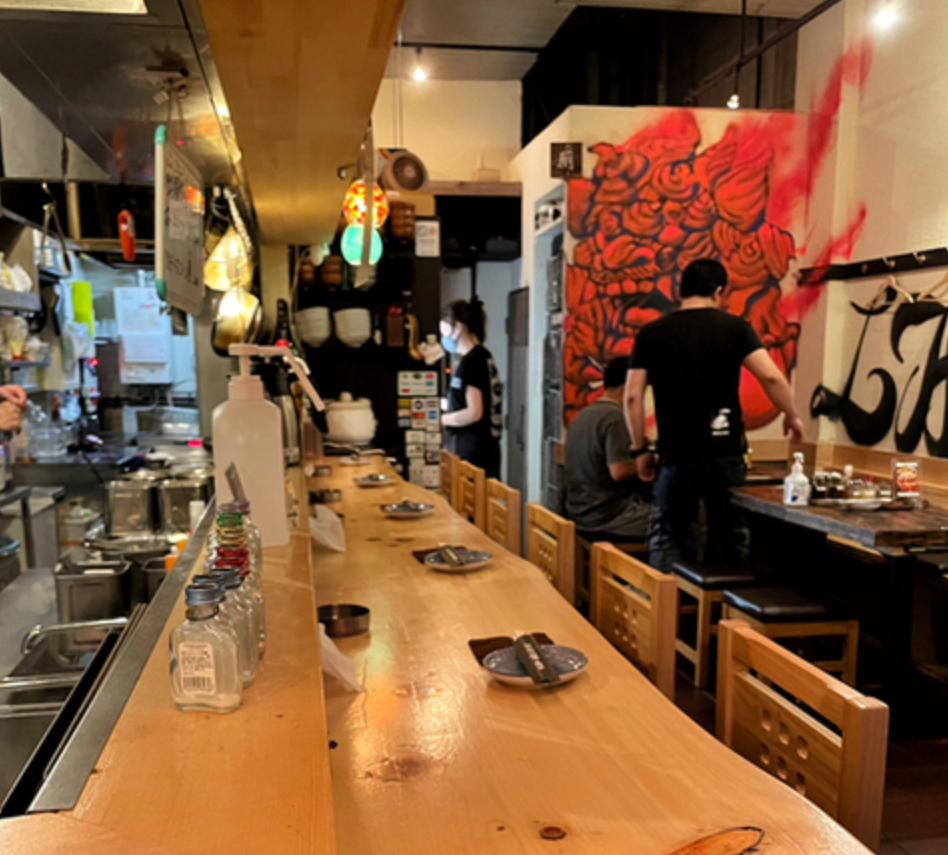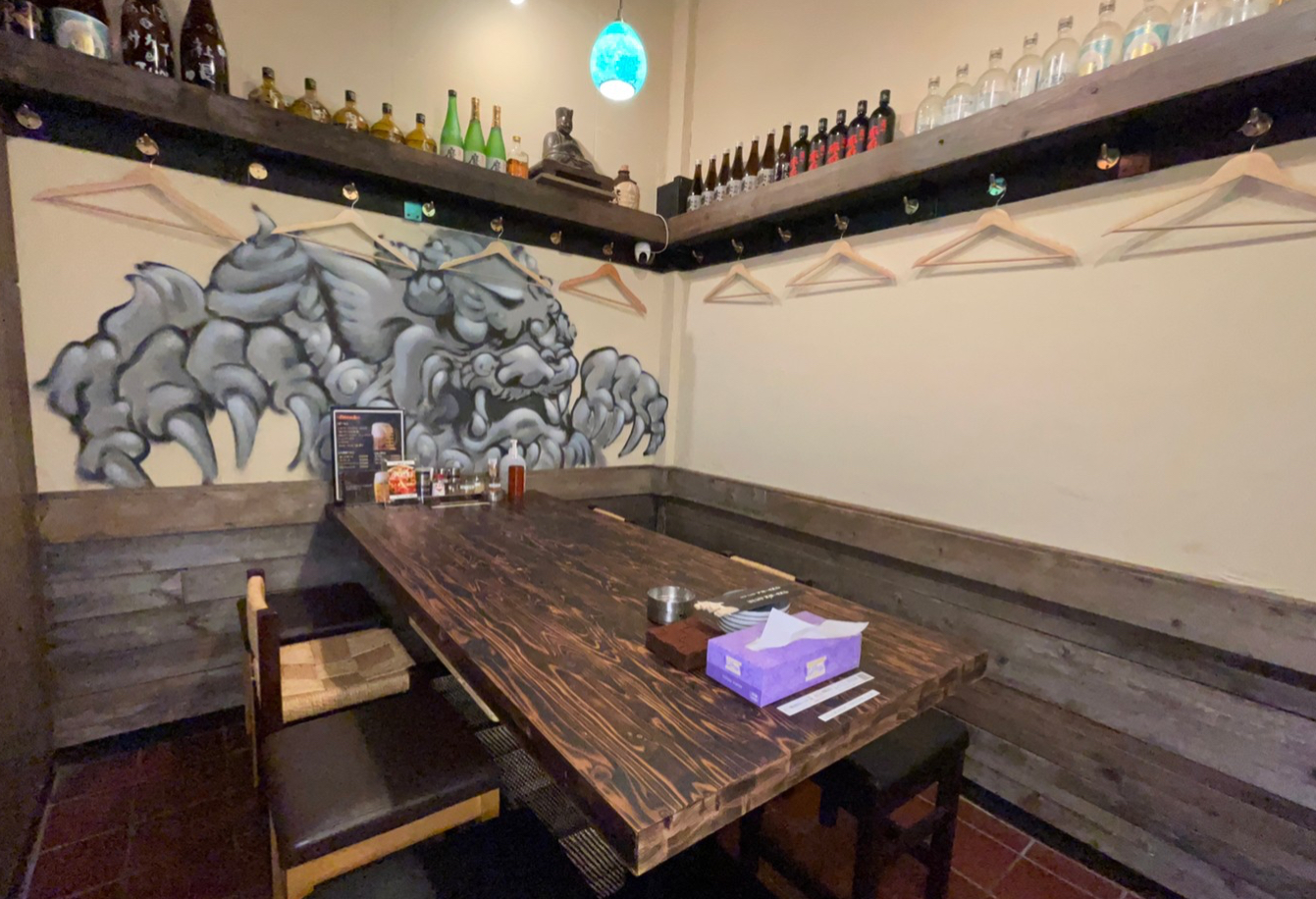 弊社グループの中でも、当店はかなり内装に力を入れました。 目を引く赤と青のシーサーが描かれた大きな絵画をはじめ、一枚板の檜のカウンターや、立地を活かした秘密基地のような店舗、開放感溢れる高い天井、くつろぎながらお食事を楽しめる大画面のテレビなど、多くの工夫を施し、快適な空間を目指しております。